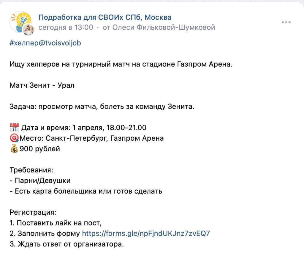 Такое объявление появилось в одном из тематических пабликов во «ВКонтакте». В посте массовку называют «хелперами» и предлагают 900 рублей за посещение матча. «Задача — просмотр матча, болеть за команду Зенита», — говорится в сообщении.