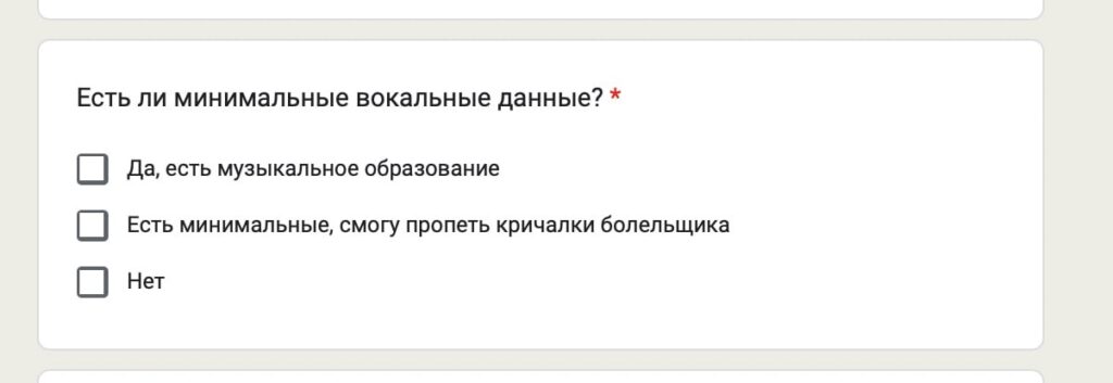 В паблике размещена ссылка на анкету, которую необходимо заполнить потенциальным соискателям. В ней, помимо прочего, спрашивают о том, есть ли у участников «минимальные вокальные данные», чтобы пропеть кричалки болельщиков.