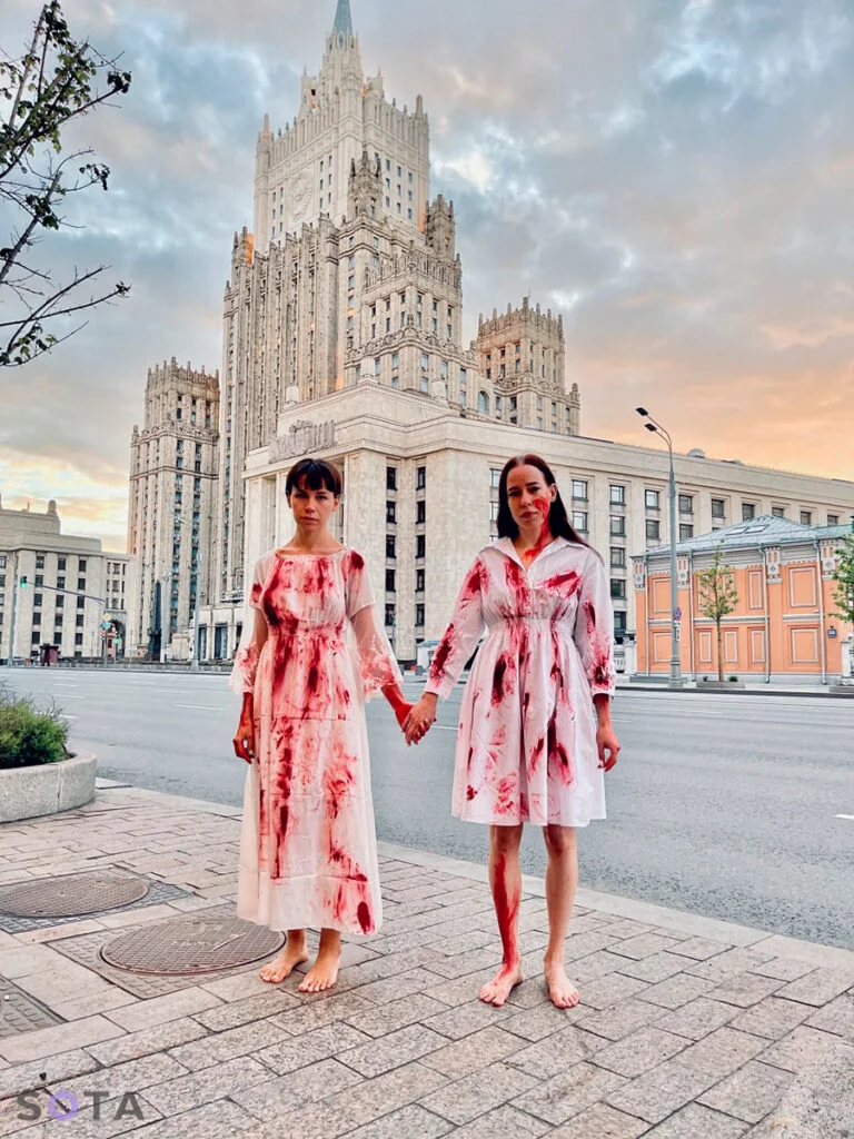 Активистки Наталья Перова и Людмила Анненкова 29 мая провели у здания Министерства иностранных дел РФ в Москве акцию «Нам не отмыться от крови». Две девушки, взявшись за руки, встали на фоне здания ведомства в белой одежде, залитой красной краской, изображающей кровь, — так они выразили свой протест против военных действий в Украине и почтили память убитых мирных жителей. За эту акцию их задержали и подвергли преследованию по трём статьям.