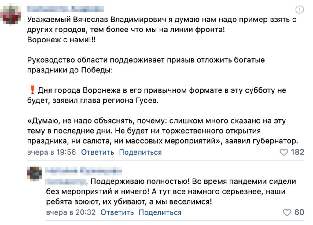 «В тот самый момент, когда рядом с Белгородом проходят боевые действия, гибнут наши Российские парни, страдают жители области от обстрелов, в Ваших силах отменить фестивали, катки, фейерверки и прочие праздники, которые проводятся за счёт бюджета! Давайте вместо праздников инвестируем эти деньги в наши вооружённые силы, поможем беженцам и вынужденным переселенцам. Это наши люди и сейчас самое время не устраивать праздники, а помогать!» — говорится в петиции (орфография и пунктуация автора сохранены).