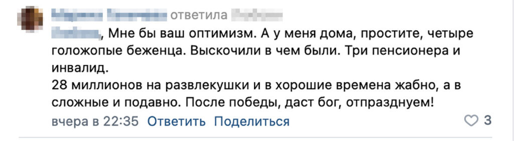 Предприниматель добавил, что недавно он был на границе, в пункте Логачевка, и видел там людей, которые прибывали со стороны Харьковской области. «Их много, им нужна помощь, — говорит Костюк. — Это в первую очередь наши люди — русские! Люди прибывают, их надо одеть, обуть, накормить, предоставить условия. Поэтому на текущий момент считаю абсолютно неуместными траты на праздники, катки, фестивали». Костюк уверен: если его петиция так быстро собрала тысячи откликов, значит, многие с ним согласны.