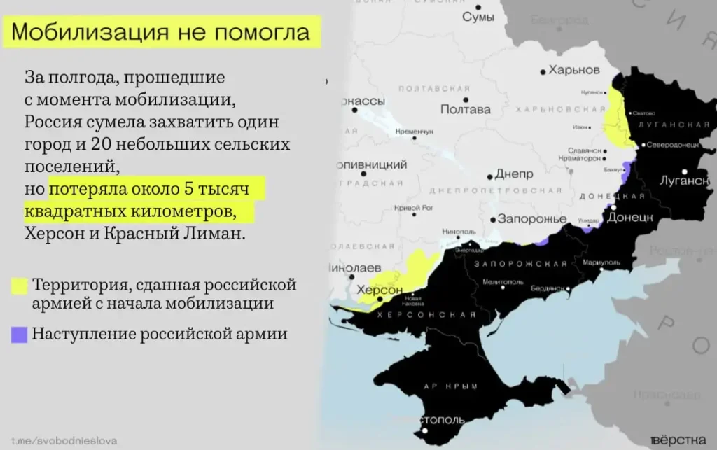 Украине удалось освободить Херсон и ещё несколько крупных городов, в том числе Лиман. Всего за шесть месяцев ВСУ заняли несколько сотен населенных пунктов.