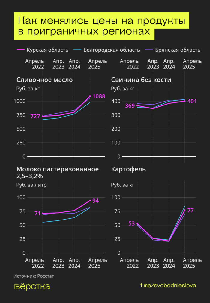 Базовые продукты питания — мясо, молочку, хлеб, овощи — Курская область традиционно производит сама. На рост их стоимости могло повлиять вторжение ВСУ. Из-за боевых действий в августе 2024 года Курская область потеряла сотни тысяч голов скота и тысячи центнеров урожая. Объём сельхозпродукции оказался вполовину меньше, чем в 2023 году.