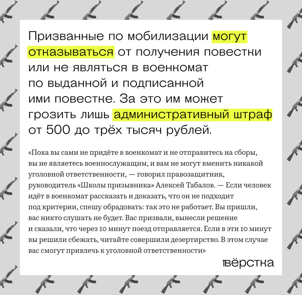 Также, по словам Миры, мужчина в форме сказал, что по повестке обязательно надо прийти в военкомат, иначе Алику грозит 10 лет тюрьмы, а «все вопросы к Путину». В действительности за неявку в военкомат грозит административный штраф.