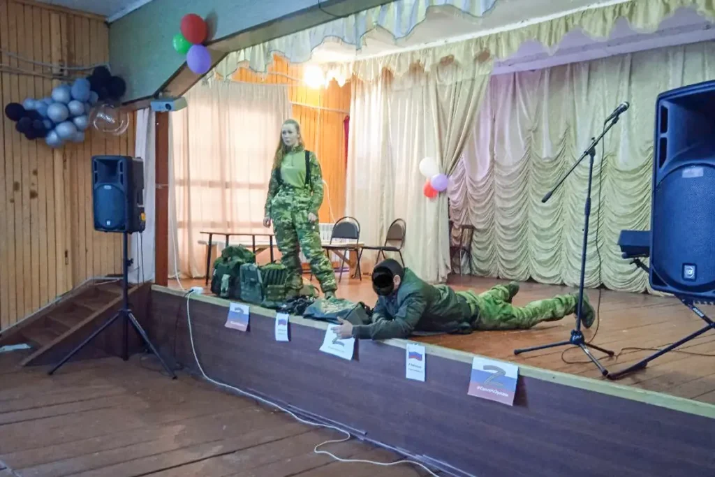 Руководитель движения «Золотые руки ангела» Дарья Абрамова и приглашенный боец презентуют новую экипировку детям и взрослым в Доме культуры села Вознесенское, Кемеровская область. Источник: telegram-канал «Золотые руки ангела».
