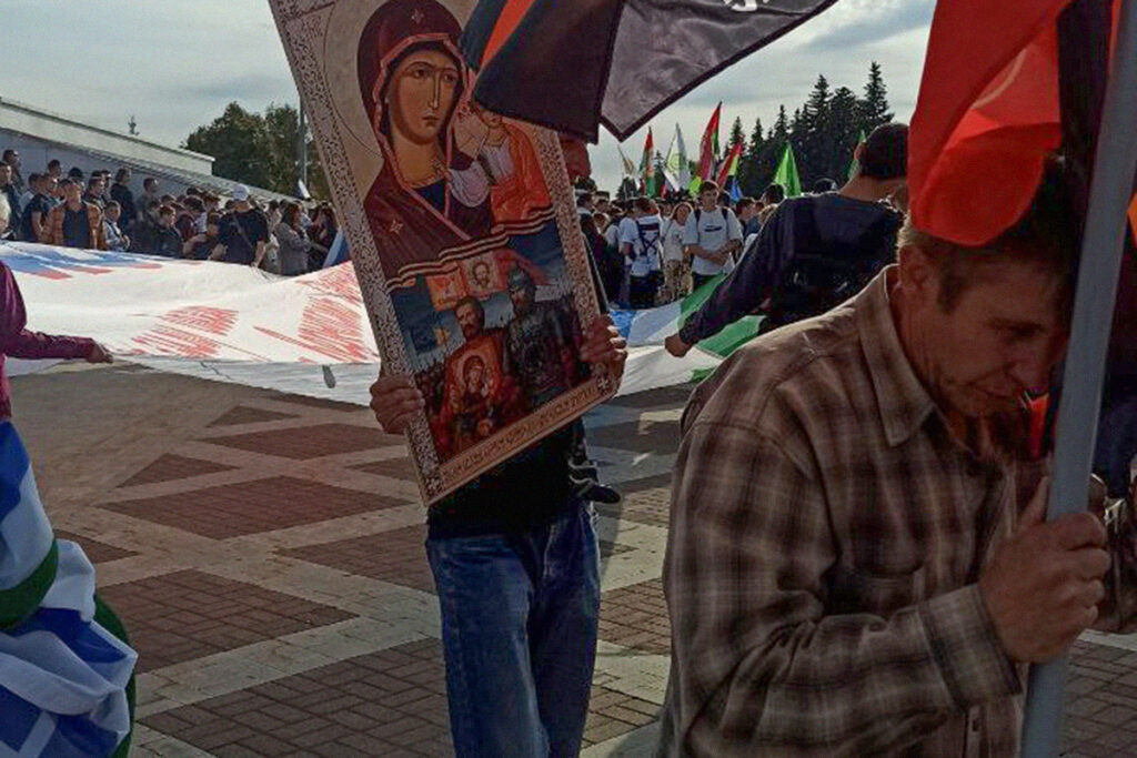 Устав от ожидания, студенты Башкирского госуниверситета (судя по флагам) начали распевать кричалки своего — географического — факультета. «Чего они кричат? Первые на Донбасс поедут что ли?» — отреагировала юная девушка в топе и солнечных очках. Её подруга пожала плечами и предложила обсудить, как они проведут выходные.