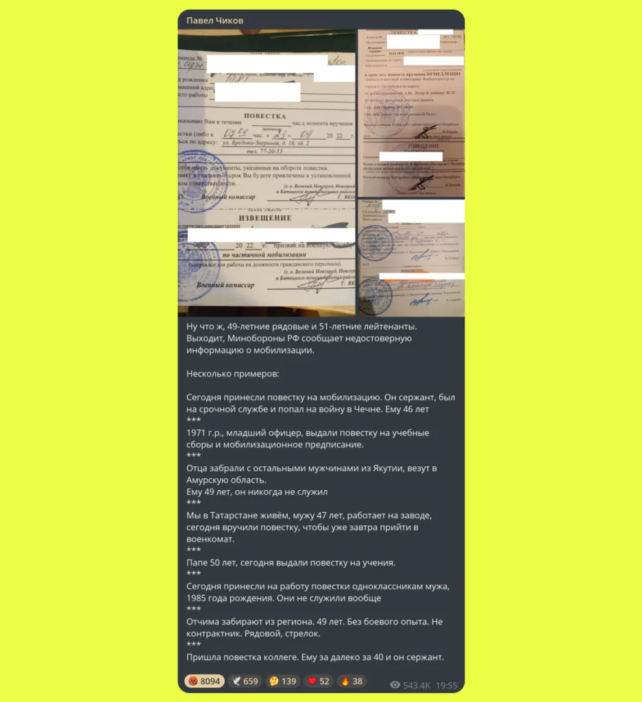 Также, по данным юриста Павла Чикова, в Москве призвали 63-летнего полковника, в Якутии — 58-летнего мужчину, который никогда не служил, но имеет военно-учётную специальность, а в Самаре — 60-летнего сержанта. В Бурятии повестка пришла отцу пятерых детей, который никогда не служил и не был в запасе.