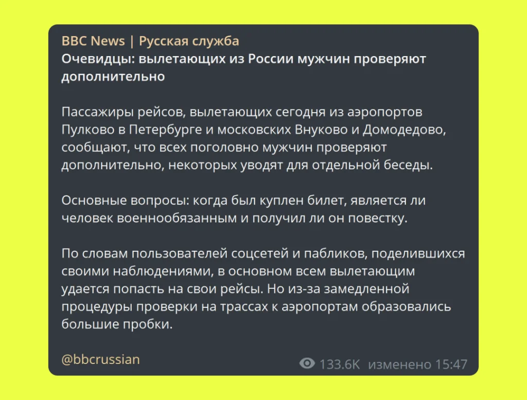 Мужчин, вылетавших 22 сентября из Пулково в Санкт-Петербурге, из Внуково и Домодедово в Москве, проверяли дополнительно. Некоторых при этом уводили для отдельной беседы, где спрашивали, когда был куплен билет, является ли человек военнообязанным и получил ли он повестку. Кроме того, в нескольких регионах военные комиссары подписали приказы, запрещающие запасникам покидать места жительства.