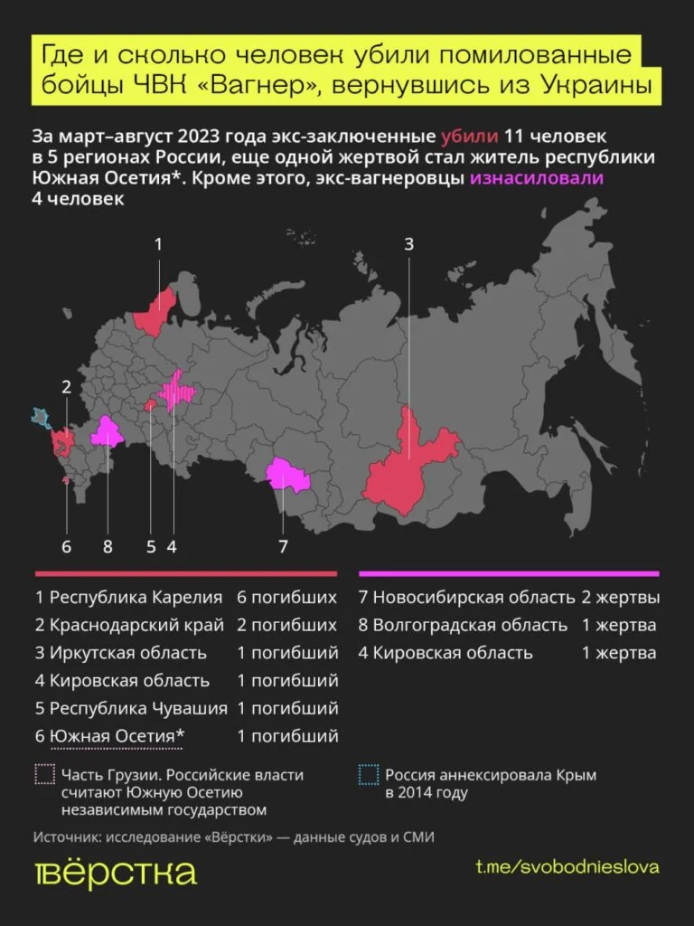 Глава ЧВК «Вагнер» Евгений Пригожин утверждал, что после участия в войне против Украины на территорию России вернулись 32 тысячи бывших заключённых, ранее завербованных в ЧВК. По его словам, те, кто вышел на свободу после участия в боевых действиях, совершили 83 преступления, что «в 80 раз меньше, чем у лиц, освобождающихся из мест лишения свободы за аналогичный период без заключения контракта с ЧВК». При этом никаких подтверждений своих слов или разбивки преступлений по категориям Пригожин не привел.