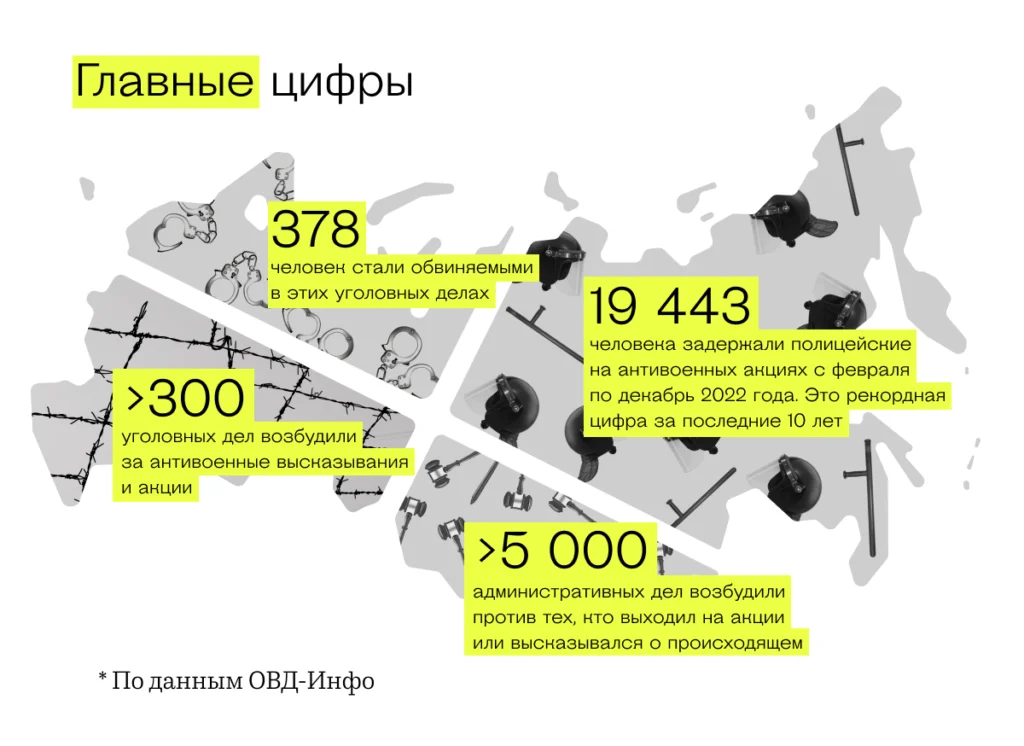 Цифры подтверждают активное сопротивление россиян: более 19 тысяч противников войны в 2022 году отправили в автозаки, более пяти тысяч — понесли административное наказание.