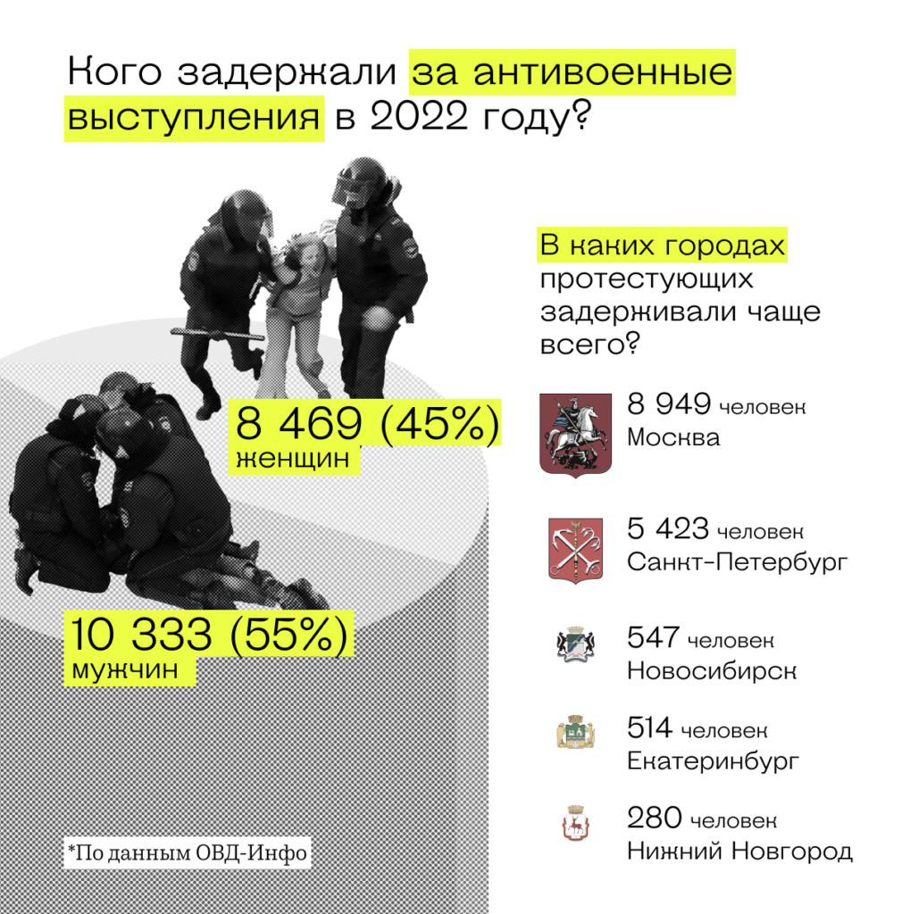 «Несмотря на то, что большая часть задержаний (порядка 17 тысяч — Прим. ред.) пришлась на первую и вторую протестную волну, остальные распределены равномерно в течение года, — говорит юристка „ОВД-Инфо“ на условиях анонимности. — Речь про одиночных пикетчиков и задержанных за дискредитацию армии из-за постов в соцсетях и других антивоенных действий. На самом деле, количество людей в России, настроенных против войны, больше, чем кажется. По нашим подсчетам, без задержаний с конца февраля прошло лишь 18 дней. То есть практически каждый день кто-то протестует против войны».