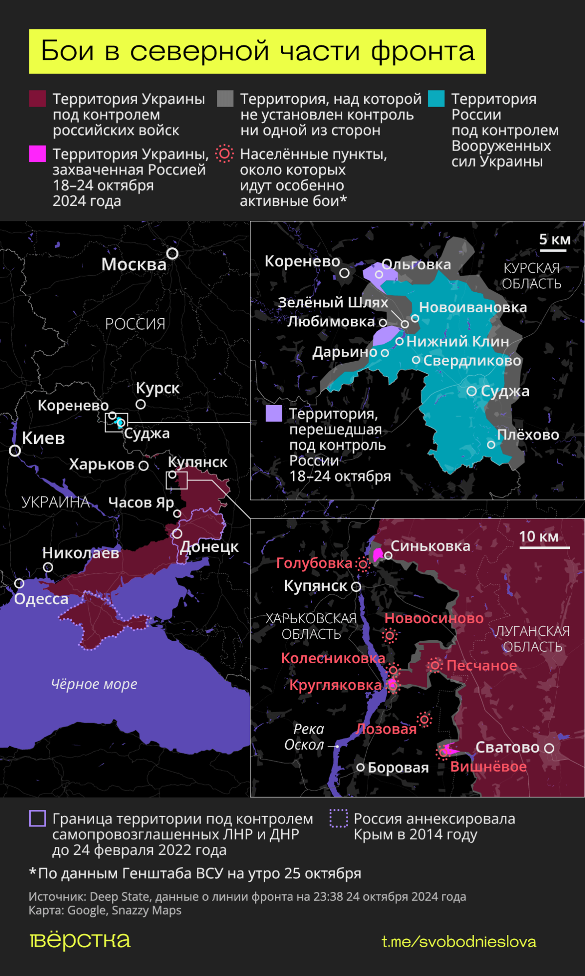 24 октября Минобороны России отчитывалось о наступлении и боях группировки «Север» в районах населённых пунктов Дарьино, Зелёный Шлях, Нижний Клин, Новоивановка, Плёхово и Свердликово. Появлялись сообщения о том, что российские военные полностью заняли Плёхово, но судя по DeepState село занято украинской группировкой. «Рыбарь» пишет об атаках ВСУ в окрестностях Плёхово и отмечает, что сообщения о взятии села ВС РФ не подтверждаются.