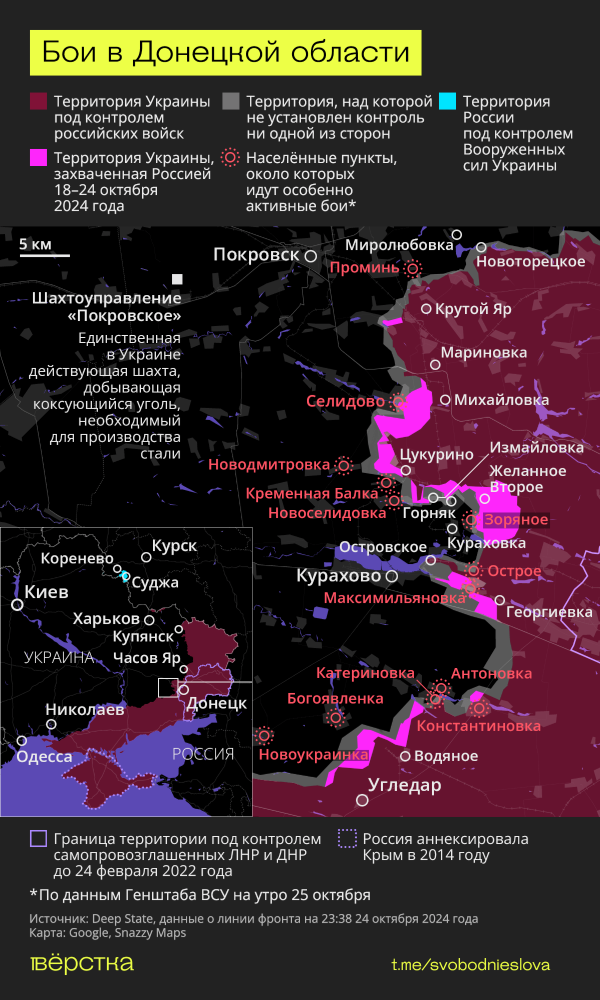 На кураховском направлении российские войска заняли территории восточнее Горняка и посёлка Кураховка. Теперь под контролем ВС РФ находится село Желанное Второе, также военные продвинулись в сторону села Зоряное и штурмуют Горняк. По данным DeepState на утро 24 октября, российская армия зашла в тыл ВСУ на севере города. Так как на востоке от Горняка теперь нет украинских военных, россияне могут использовать дорогу Донецк — Покровск до Селидово без угрозы обстрелов, таким образом улучшая снабжение подразделений, которые будут готовиться к наступлению на Покровск.