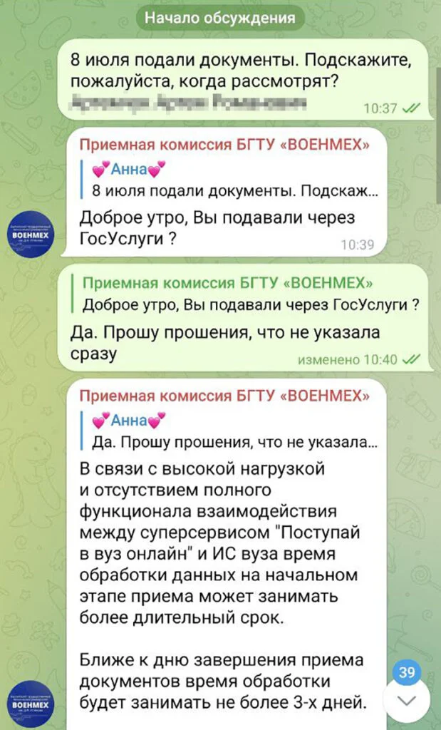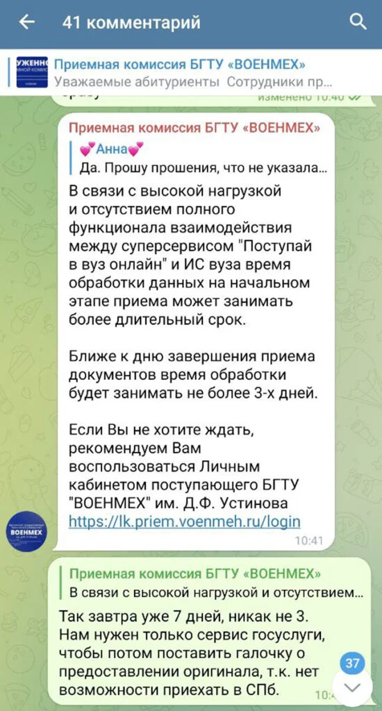 Мама абитуриента из Ярославской области Анна называет подачу документов через портал катастрофой. «Мы подали документы в несколько петербургских вузов на „Строительство“: в Аграрный, „Военмех“ имени Устинова, Петербургский государственный университет путей сообщения и СПбГТИ. Во все подавали через „Госуслуги“, потому что билеты до Петербурга нам не по карману. В итоге мне пришлось две недели названивать вузам и спрашивать, где наши документы, потому что вузы их просто не видели. Хотя на „Госуслугах“ было написано, что всё отправлено», — рассказывает Анна.