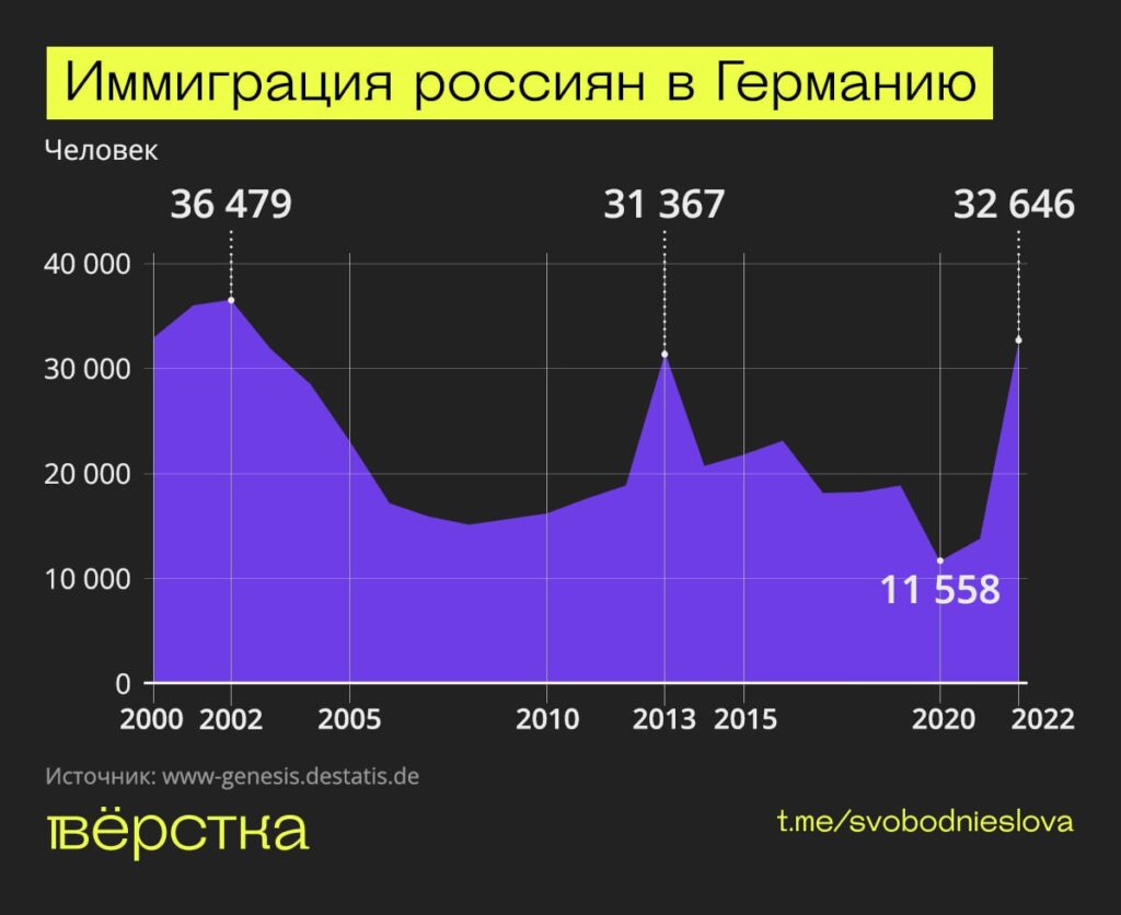 Резкий всплеск иммиграции произошёл в 2013 году — после протестов 2012 года и возвращения Владимира Путина на пост президента. Если в 2012 году из России в Германию переехали 18 812 граждан, то в 2013 уже 31 367 человек. Затем поток переселенцев вновь снижался, к 2021 году он достиг 13 718 человек. Таким образом, в первый год войны иммиграция из России в Германию увеличилась почти в 2,4 раза в сравнении с предыдущим годом.