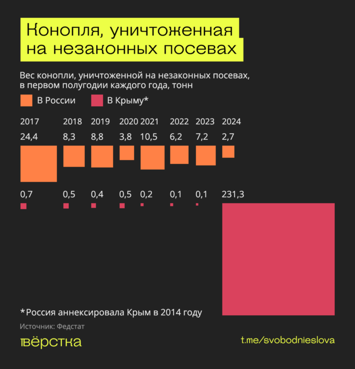 За первое полугодие 2024-го в аннексированном Крыму отчитались об уничтожении на незаконных плантациях аномально большого объёма конопли — 231‑й тонны. Это в 86 раз больше, чем по всей России, и в сотни раз больше предыдущего крымского максимума 2017 года. При этом, если верить официальным данным, незаконные плантации в Крыму показывают нереальную урожайность — 112 кг конопли на 1 кв. м. Адекватного объяснения такой статистики нет. Крымские силовики могли начать учитывать уничтоженную массу дикой конопли как выращенную на незаконных плантациях, а источники «Вёрстки» в регионе утверждают, что заметили ужесточение борьбы с местными поставщиками и потребителями конопли.