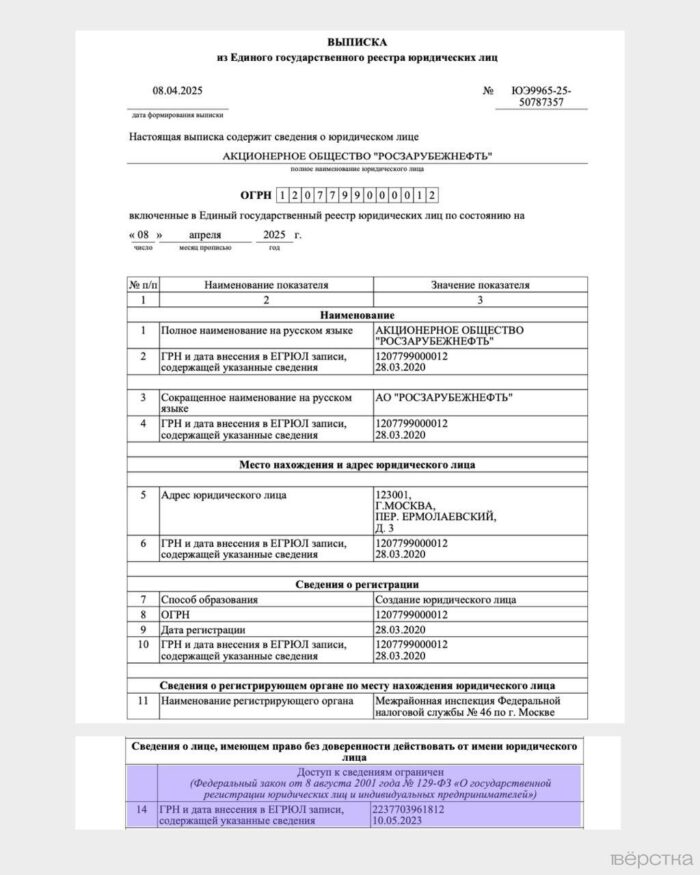 Ещё раньше из ЕГРЮЛ пропала информация о том, кто возглавляет владельца компании «Петромост» — принадлежащее государству АО «Росзарубежнефть», обратила внимание «Вёрстка». С момента учреждения в 2020 году её гендиректором был сослуживец Игоря Сечина Николай Рыбчук, однако с 20 мая 2023 года доступ к этой информации также «ограничен».