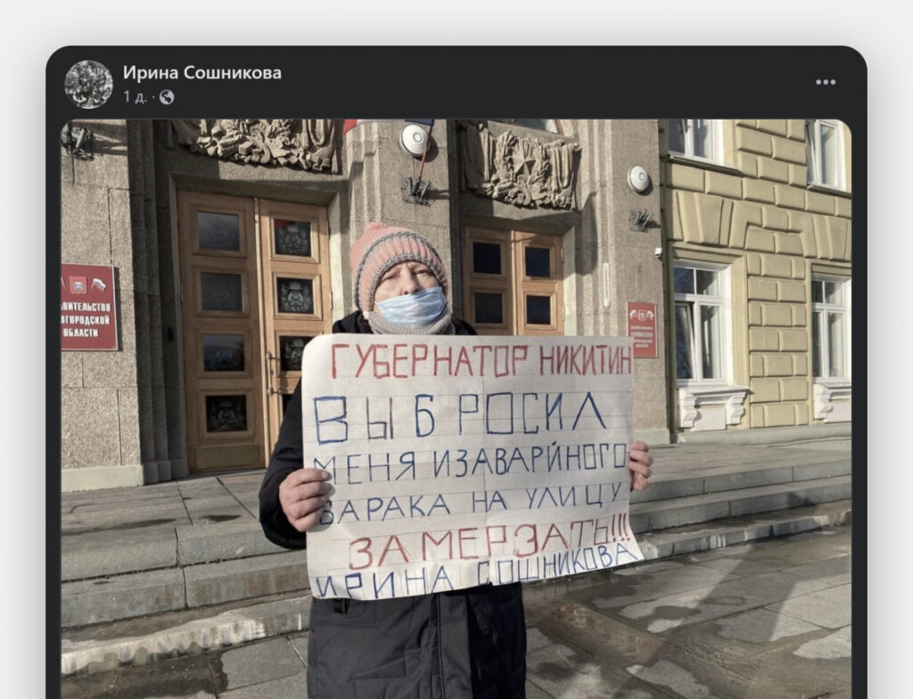 Сошниковой 64 года, она живёт в посёлке Лычково, в старом деревянном бараке без горячей воды и с дровяным отоплением. Пока Ирина работала, а её мама была жива, пенсии и зарплаты было достаточно на жизнь и на покупку дров. Сейчас Сошникова и сама на пенсии, а её мамы нет в живых. Денег на отопление больше не хватает.
