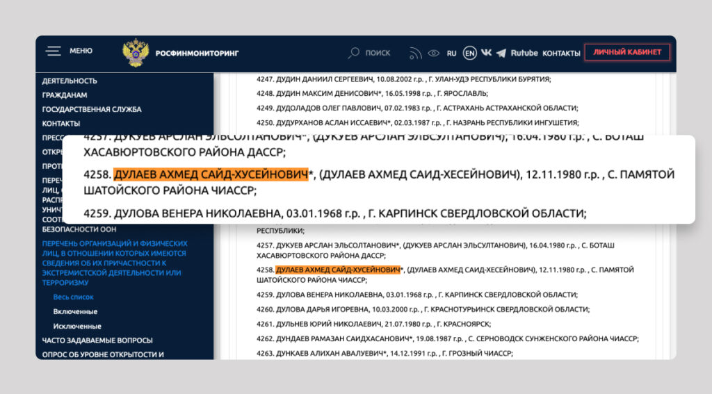 «Вёрстка» исследовала список 2 425 чеченских добровольцев, который в мае 2022 года опубликовало ГУР Минобороны Украины, и верифицировала многих его участников по соцсетям и картотекам российских судов. Среди них оказались 14 человек, находившихся в разные годы в перечне террористов Росфинмониторинга. Пятеро оставались в этом списке к моменту их отправки на войну (одного из них исключили в октябре). Среди добровольцев оказался террорист из окружения Шамиля Басаева, получивший награду Ичкерии за нападение на больницу в Будённовске, и боевик из отряда полевого командира Руслана Гелаева.