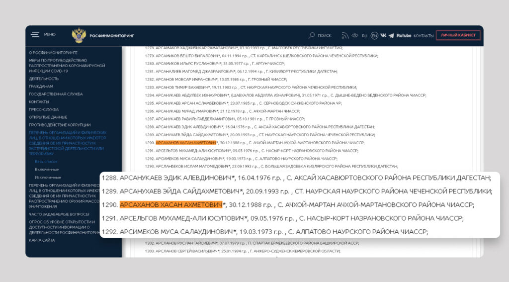 Ещё один оказавшийся в перечне Росфинмониторинга доброволец — 33-летний рецидивист Хасан Арсаханов. В этом перечне он находится как минимум с 2011 года.