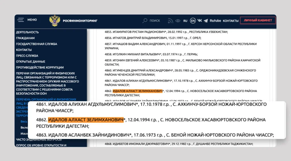 Самым молодым из перечня Росфинмониторинга в опубликованном списке чеченских добровольцев оказался 28-летний Алхаст Идалов из Чечни под номером 1885. В перечне террористов мужчина находится с февраля 2020 года. Судебное решение, связанное с его включением в этот список, найти не удалось. О возбуждённых против него уголовных делах также неизвестно.