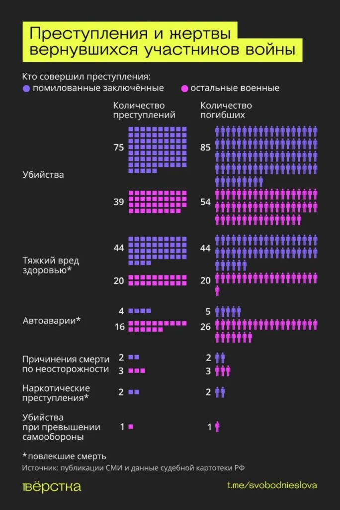 По подсчетам «Вёрстки», всего вернувшиеся участники войны за 2,5 года совершили 114 убийств, в результате которых погибли 139 человек. Среди них: