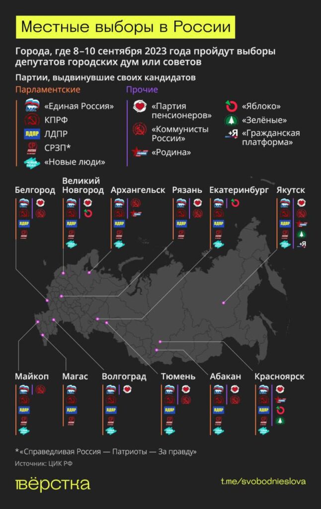 ▫️ Городские представительные органы изберут в 11 столицах регионов, а в Хабаровске состоятся единственные в 2023 году прямые выборы мэра регионального центра. Проблемными для единороссов могут стать голосования в Великом Новгороде (там в 2018 году победили кандидаты от КПРФ), а также в Красноярске, Екатеринбурге, Архангельске и Якутске, где у депутатов от партии власти сейчас нет убедительного численного преимущества над соперниками