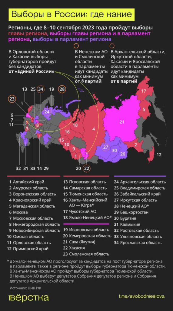 ▫️ Региональные парламенты будут выбирать жители 16 российских регионов и четырёх аннексированных территорий Украины. В двух из них — Иркутской области и Хакасии — на прошлых выборах в 2018‑м году партию власти победила КПРФ